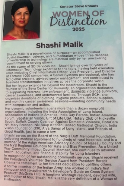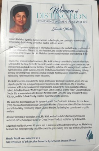 Shashi Malik, received recognition from New York State Senate βWoman of Distinction 2025β in Albany on May 13th, 2025 for contributions.